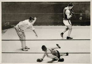 This is an original 1932 halftone print of boxers Bruno Valfrid Ahlberg, Finland Bronze; and Luciano Fabbroni, Italy in the welterweight boxing competition at the 1932 Summer Olympics.