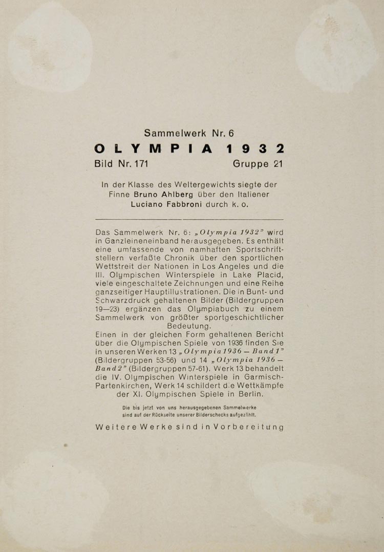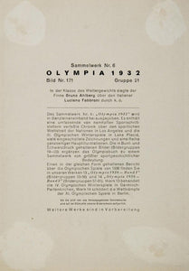 Period Paper is pleased to offer a collection of original prints from the 1932 Summer Olympics (Games of the X Olympiad) held in Los Angeles. This unique collection was printed in 1932 in Germany and is in excellent condition. The images have an accompanying description (in German) on the reverse. Please scroll down to see the image of the reverse. All the prints were hand tipped-in and some may have slight scuffing or adhesive residue on the reverse from the removal process. These are all excellent original print items for the collector of Olympic memorabilia and would look great framed.