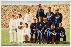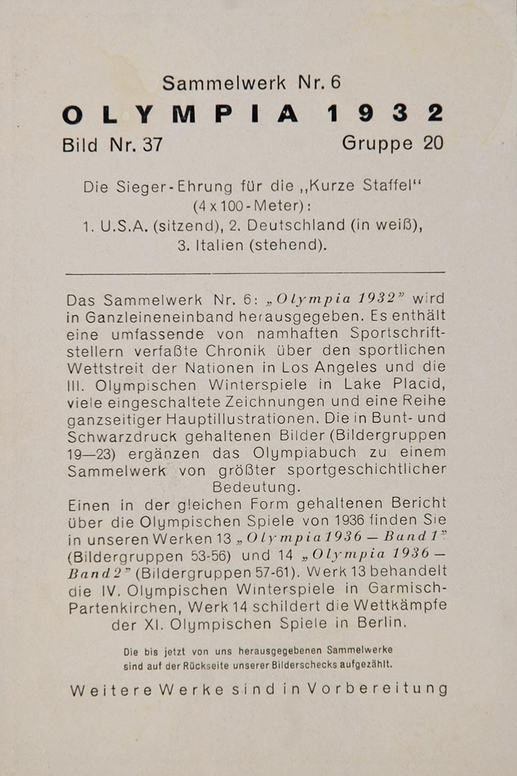 This is an original 1932 color print of the winning teams of the 4_100 meter relay event at the 1932 Summer Olympics: USA Gold, Germany Silver, Italy Bronze.
