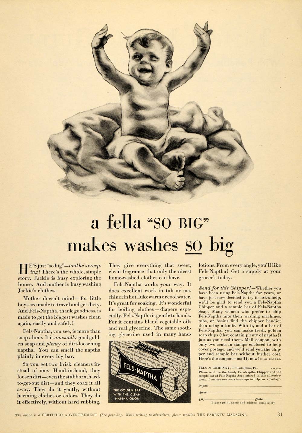 This is an original 1932 black and white print ad for Fels Naptha Detergent for clothes.