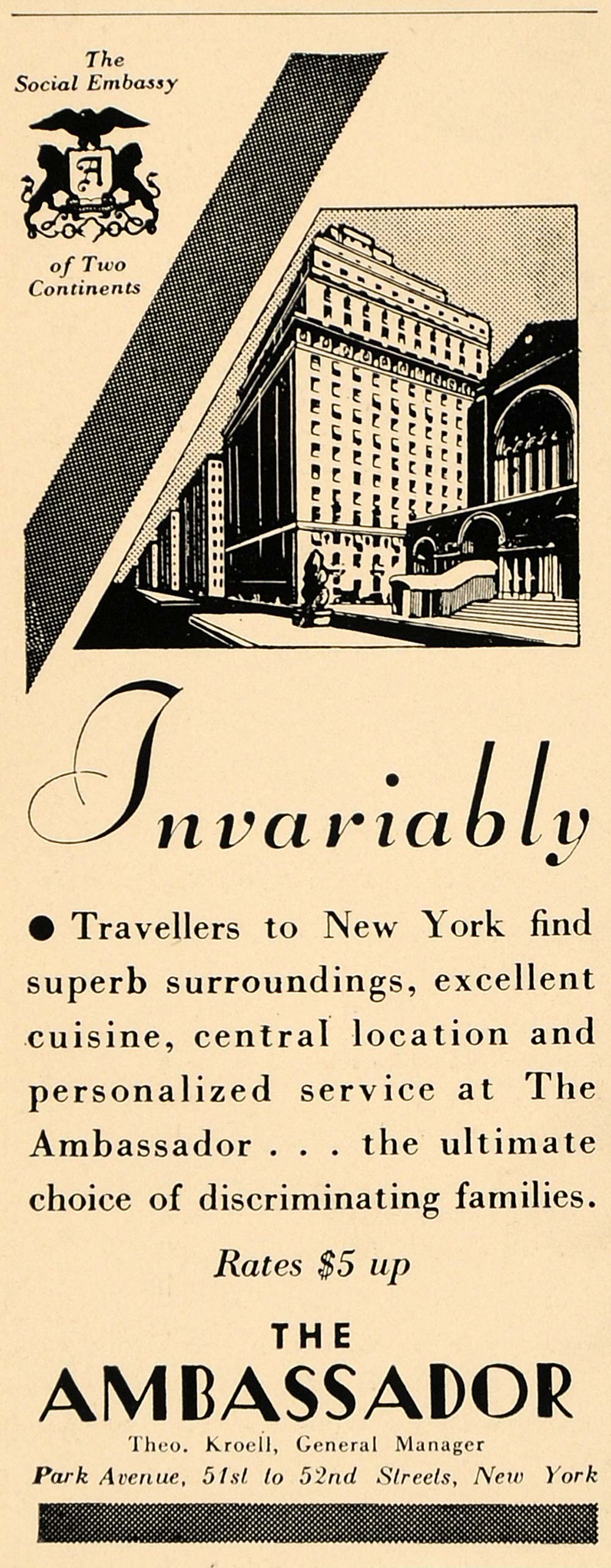 This is an original 1933 black and white print ad for the Ambassador Hotel located on Park Avenue at 51st to 52nd Streets, New York.
