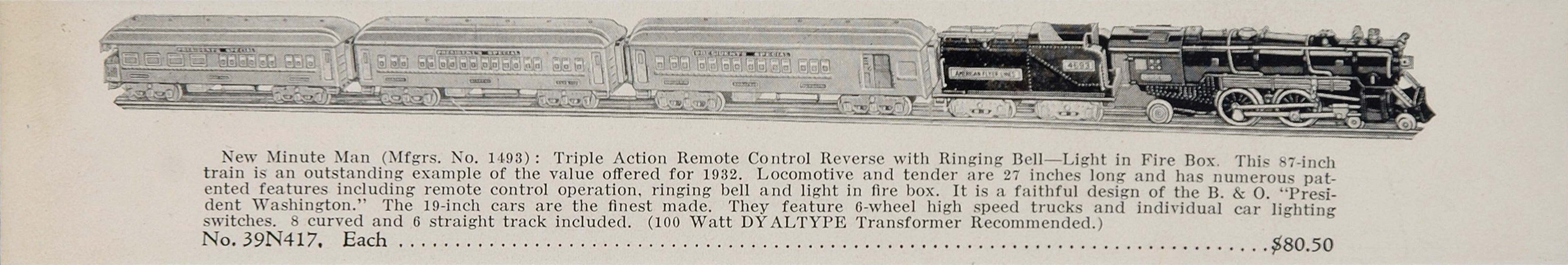 This is an original 1933 black and white print ad for the American Flyer New Minute Man model passenger train, No. 1493 -- "a faithful design of the B. & O. President Washington." An excellent original print item for the collector of antique model trains.