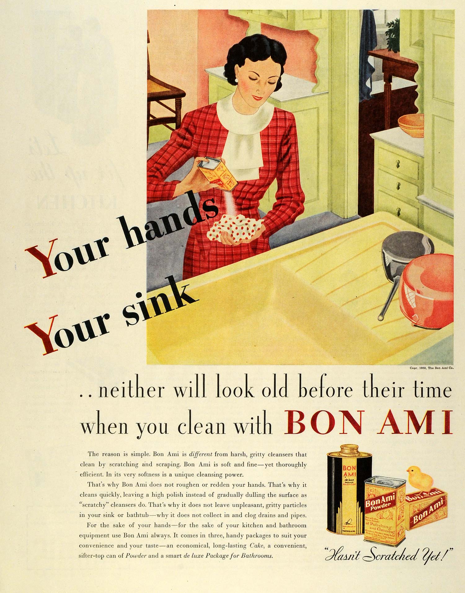 This is an original 1933 color print ad for Bon Ami Powder for polishing and cleaning.