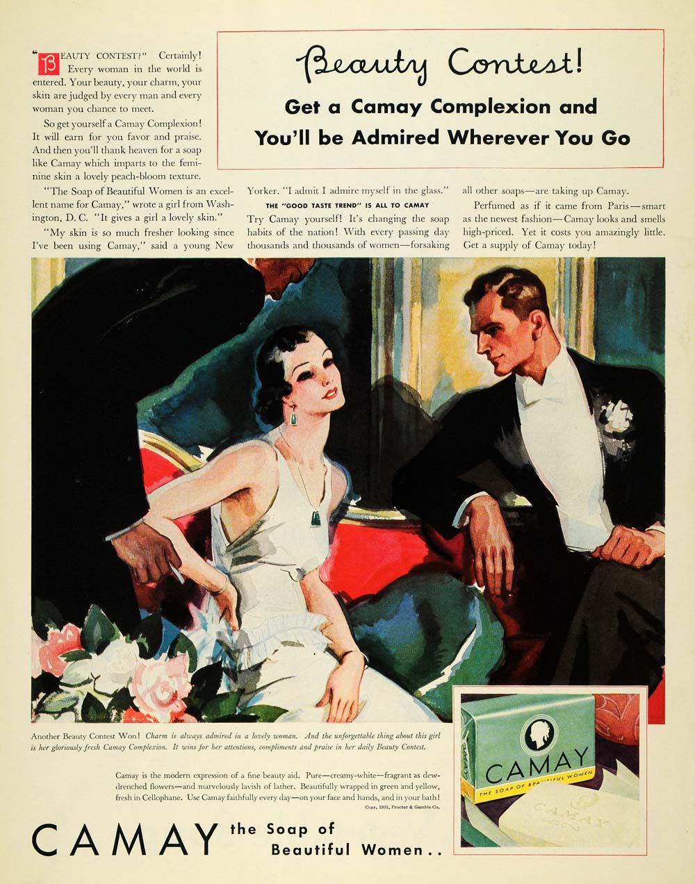 This is an original 1933 color print ad for Camay Soap, a product by Procter & Gamble.