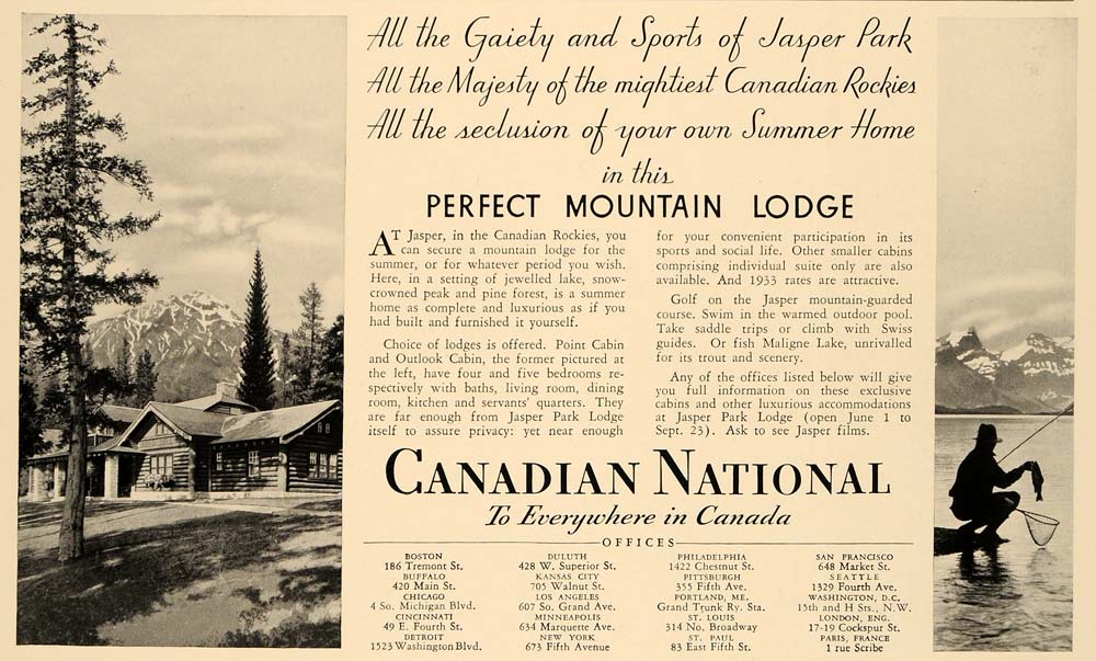 This is an original 1933 black and white print ad for the Canadian National Railway Company.