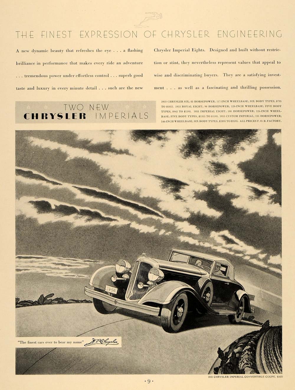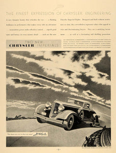 This is an original 1933 black and white print ad for the Chrysler Imperial automobile models Six, Royal Eight, the Imperial Eight, and the Custom Imperial. The illustration in this ad features the 1933 Chrysler Imperial Convertible Coupe.