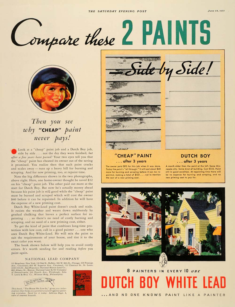 This is an original 1933 color print ad for Dutch Boy White Lead Paint by the National Lead Company. Locations are at the following addresses: 111 Broadway, New York; 116 Oak Street, Buffalo; 900 West 18th Street, Chicago; 659 Freeman Avenue, Cincinnati; 820 West Superior Avenue, Cleveland; 722 Chestnut Street, St. Louis; 2240 24th Street, San Francisco; 809 Albany Street, Boston. Locations for the National Lead and Oil Company of Pennsylvania is located at 316 Fourth Avenue, Pittsburgh. John T. Lewis and Brothers Company is located in the Widener Building in Philadelphia.