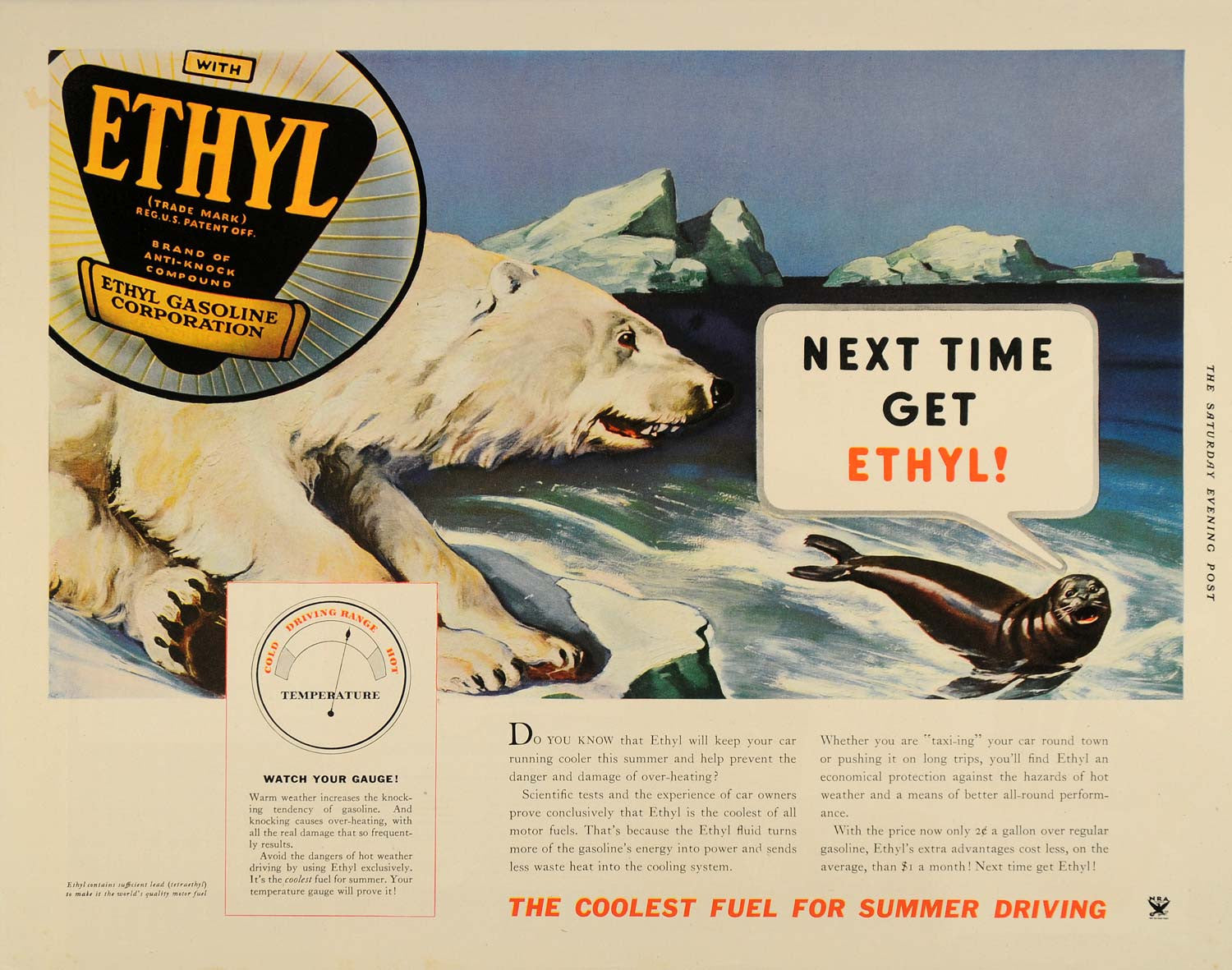 This is an original 1933 color print ad for Ethyl Gasoline by the Ethyl Gasoline Corporation located in New York City, New York.