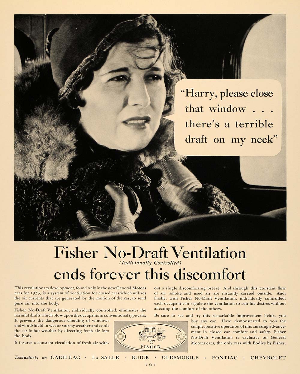 This is an original 1933 black and white print ad for Fisher Automotive Body, featuring No-Draft Ventilation (Individually Controlled), exclusively sold for the General Motors vehicles Cadillac, La Salle, Buick, Oldsmobile, Pontiac, and Chevrolet.