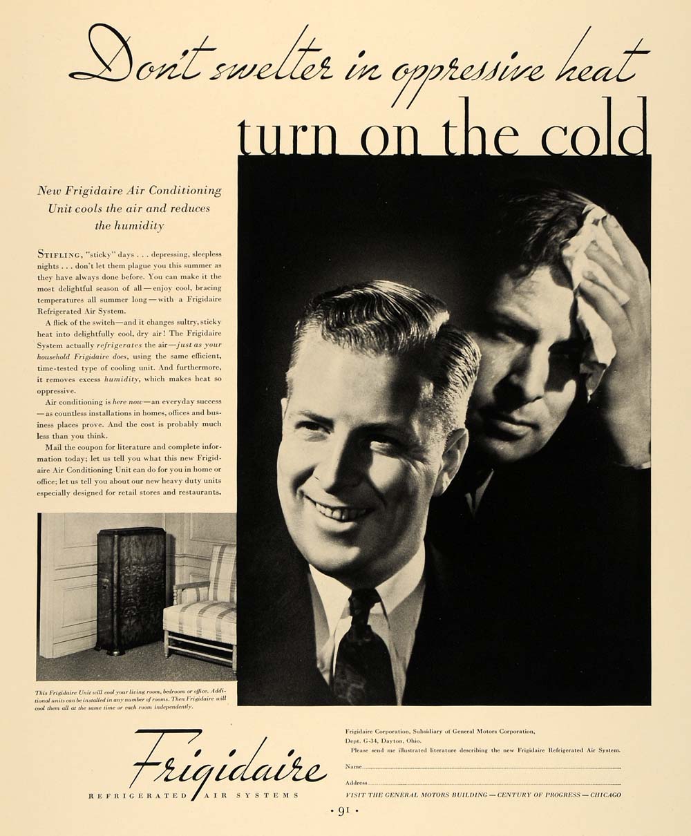 This is an original 1933 black and white print ad for Frigidaire Refrigerated Air Systems, a subsidiary of General Motors Corporation. Promoted in the ad is the new Frigidaire Air Conditioning Unit.