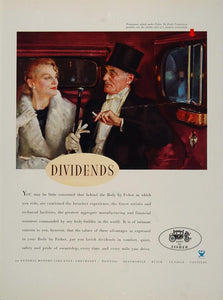 This is an original 1933 print ad for Body by Fisher on General Motors cars. The ad has a great illustration of an elegantly dressed couple on their way to or from some high society event -- perhaps the theatre or opera?