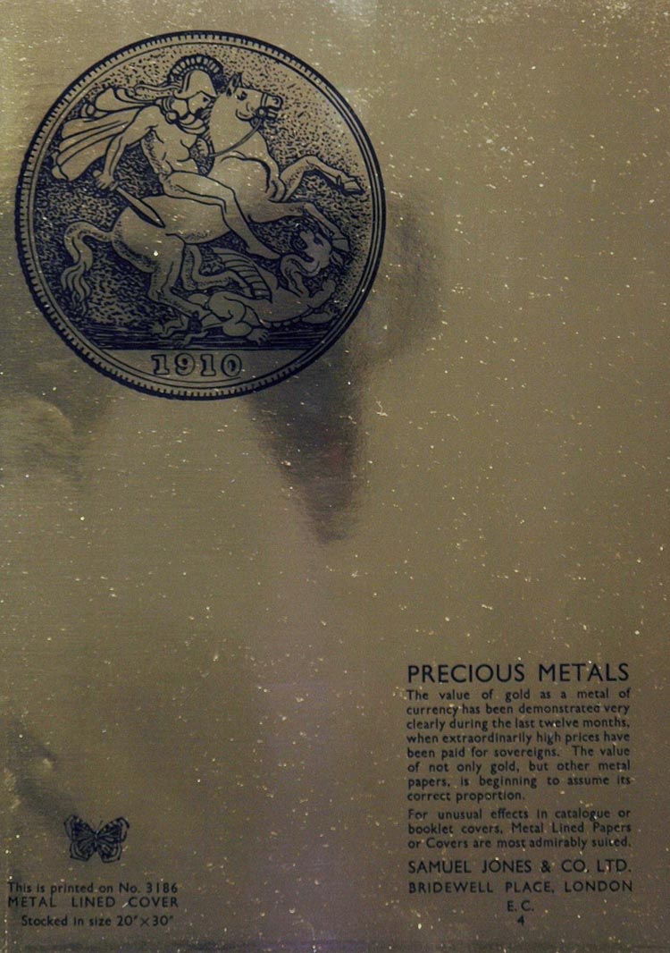 This is an original 1933 ad for metal lined covers and covers from Samuel Jones & Co., Ltd., Bridewell Place, London. The paper is an incredible gold metallic / foil stock, but unfortunately our digital image does not come close to capturing the brilliance of this paper. In the top left corner is a great illustration of what appears to be a sword wielding Roman Centurion on a horse. The date on this image is 1910.