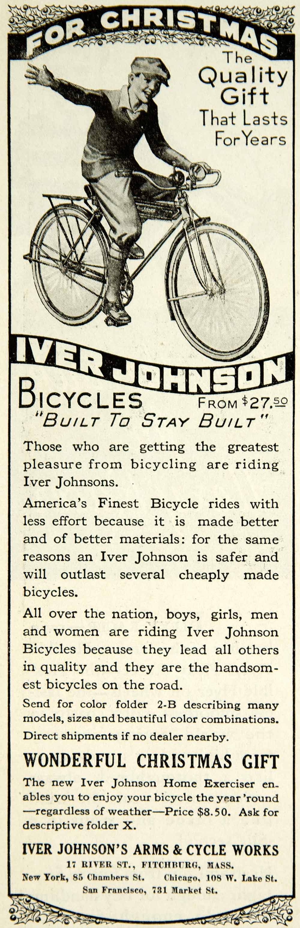 Keywords specific to this image: Vintage Advertising, Arms, Bike, Cycle Works, Kid, Youth, Boy, Transportation, Machine, Mechanical, Street, Massachusetts, Holidays, Xmas, Metal Frame, Wheel, Tire, Holly Wreath, Handlebars, Headlamp, Model, Home Exerciser, Recreation, Fitness, 85 Chambers St New York NY, 108 West Lake Street Chicago Illinois IL, 731 Market St San Francisco California CA, Company, Riding