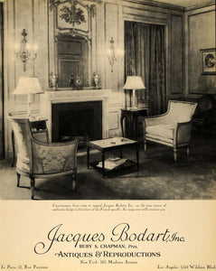 This is an original 1933 black and white print ad for Jacques Bodart, Incorporated, Antiques & Reproductions, with President Ruby S. Chapman. They are located at 11 Rue Payenne in Paris, France; 385 Madison Avenue in New York, New York; and 5514 Wilshire Boulevard in Los Angeles, California.