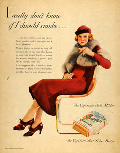 Keywords specific to this image: fashion, woman, style, stylish, smoke, smoker, smoking, plant, shoe, heel, hat, sit, sitting, seat, seated, chair, pack, taste, feminist, feminism, female, vote, voting, women Vintage Advertising