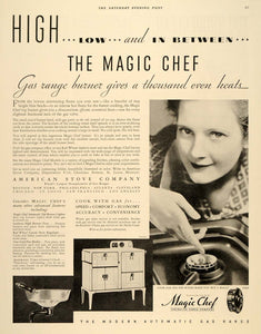 This is an original 1933 black and white print ad for The Magic Chef Gas Range Stove by the American Stove Company located at Department E-19, Chouteau Avenue, St. Louis, Missouri.