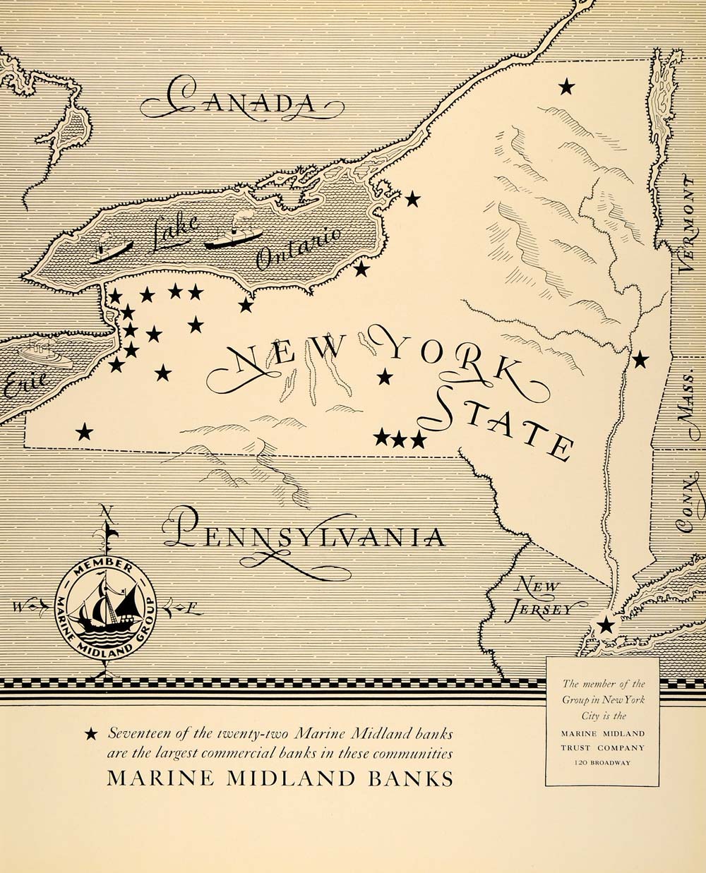 This is an original 1933 black and white print ad for Marine Midland Banks located in the New England states of New York, Pennsylvania, New Jersey, Connecticut, Massachusetts, and Vermont.