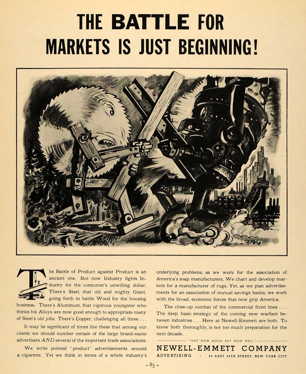 Keywords specific to this image: ad men, agency, manufacturer, manufacturing, sell, selling, buying, buy, trade, fight, competitive, competition, capitalism, industry, industries, industrial, saw, wood, bolt, tank, steel, metal, plank, blade Vintage Advertising