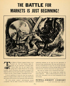 This is an original 1933 black and white print ad for the Newell-Emmett Advertising Company, located at 40 East 34th Street in New York City, New York, including an interesting textual section about "The Battle of Product Against Product". This ad features artwork by the artist Cesare.