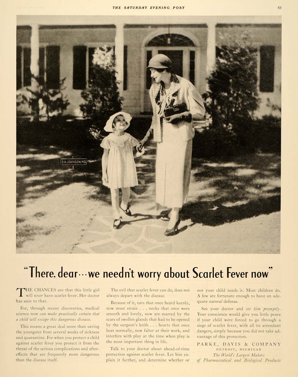 This is an original 1933 black and white print ad for a prevention to Scarlet Fever by Parke, Davis & Company located in Detroit, Michigan.