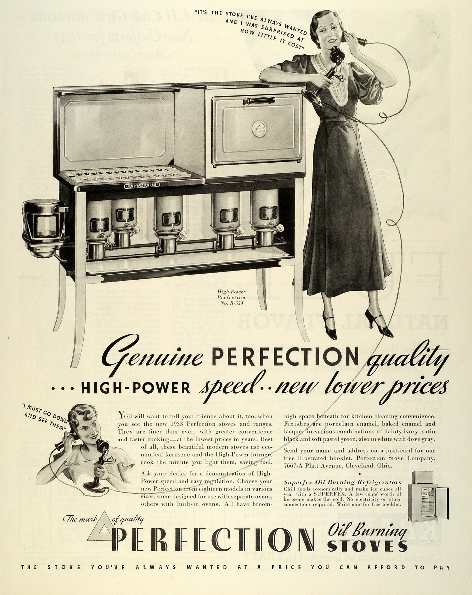 This is an original 1933 black and white print ad for Perfection Oil Burning Stoves, a product line by the Perfection Stove Company, located on Platt Avenue in Cleveland, Ohio.
