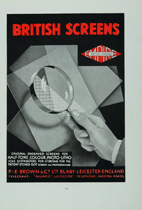 This is an original 1933 two-color ad for British Screens, original engraved screens for half-tone, color, photo-litho from F. E. Brown & Co., Ltd., Blaby, Leicester, England. This ad includes a great illustration of a magnifying glass.
