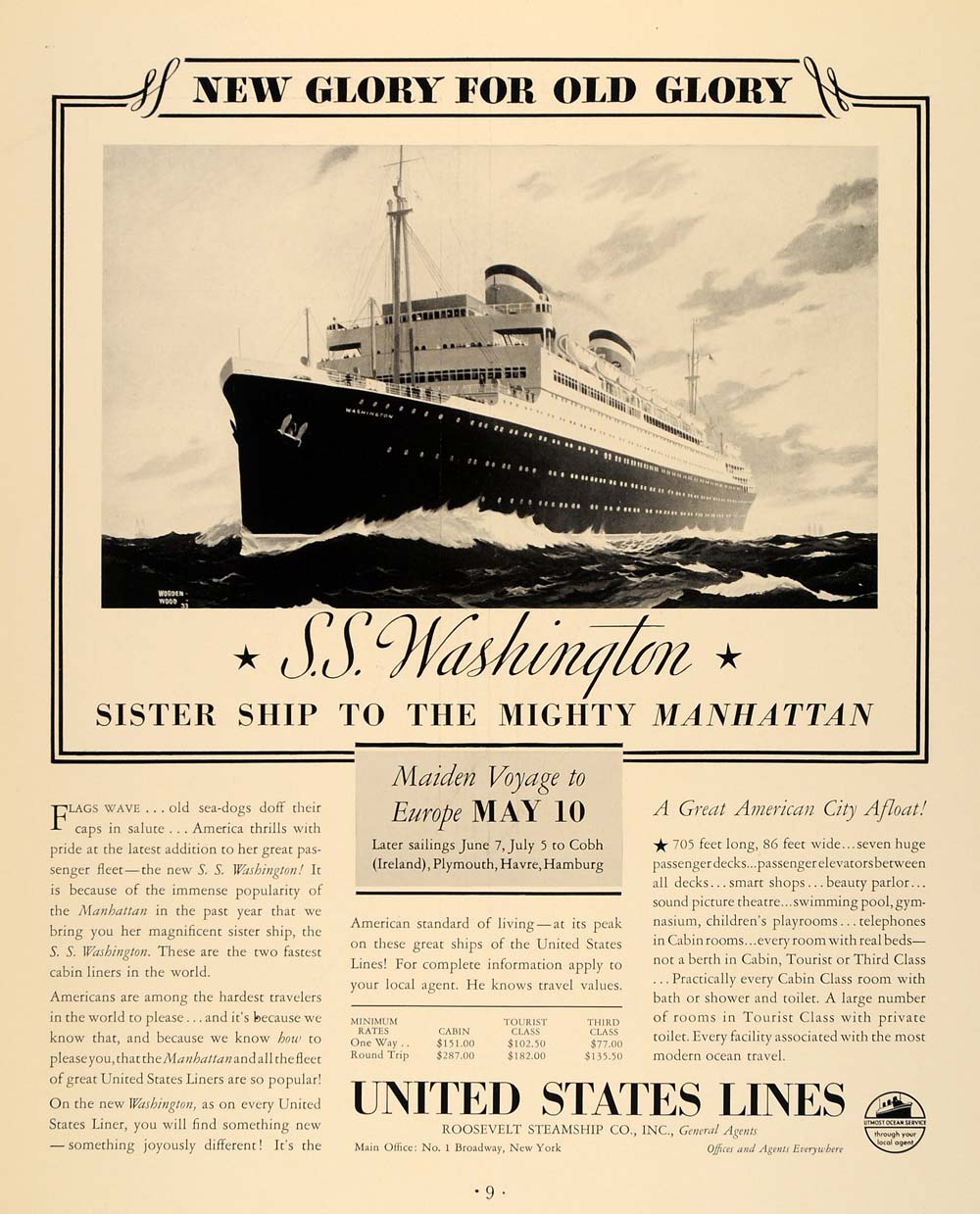 This is an original 1933 black and white print ad for the United States Lines and Roosevelt Steamship Co., Inc. Main office is located at No. 1 Broadway, New York. Pictured in the add is the S.S. Washington, a sister ship to the Mighty Manhattan.
