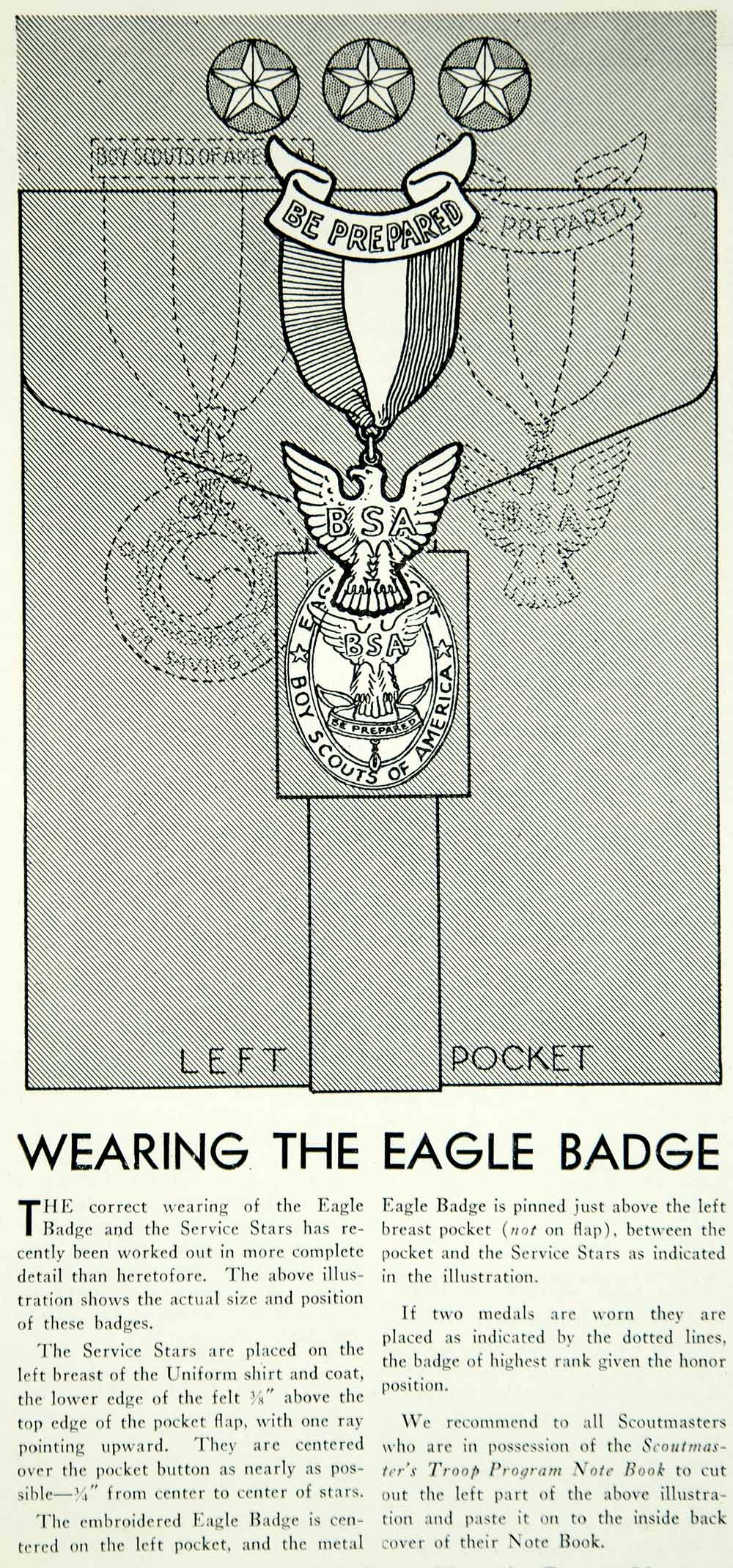 This is an original 1933 one-page black and white print article that detailed the correct placement and wearing of the Eagle Badge medal and Service Stars on the Boy Scouts of America (BSA) uniform.