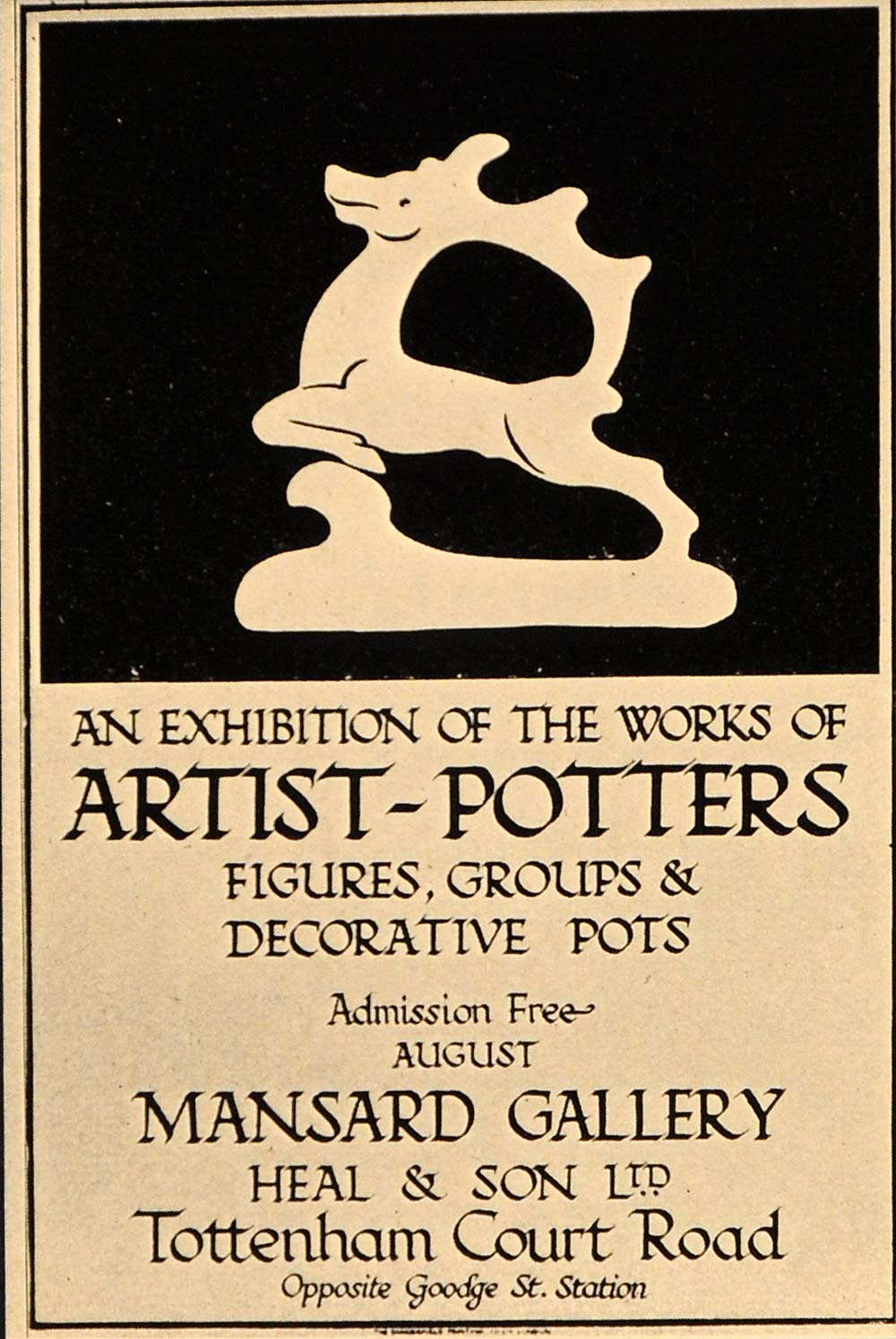 This is an original 1933 halftone print of a poster for the Artist-Potters Exhibition at Mansard Gallery, by Heal & Son, Ltd. on Tottenham Court Road in London.