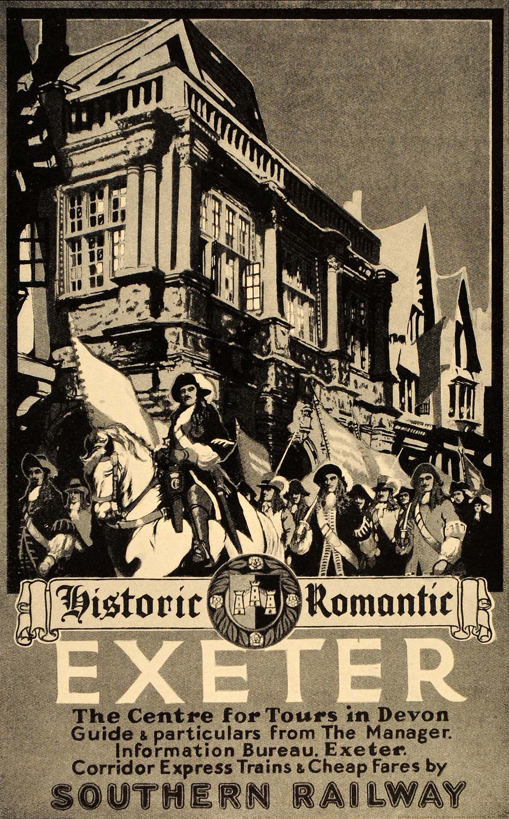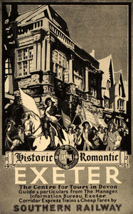 This is an original 1933 halftone print of a poster for the Southern Railway advertising travel to historic, romantic Exeter, Devon, England.