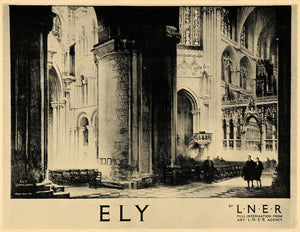 This is an original 1933 halftone print of a poster for the London & North Eastern Railway (LNER) with an illustration of the interior of the magnificent Ely Cathedral.