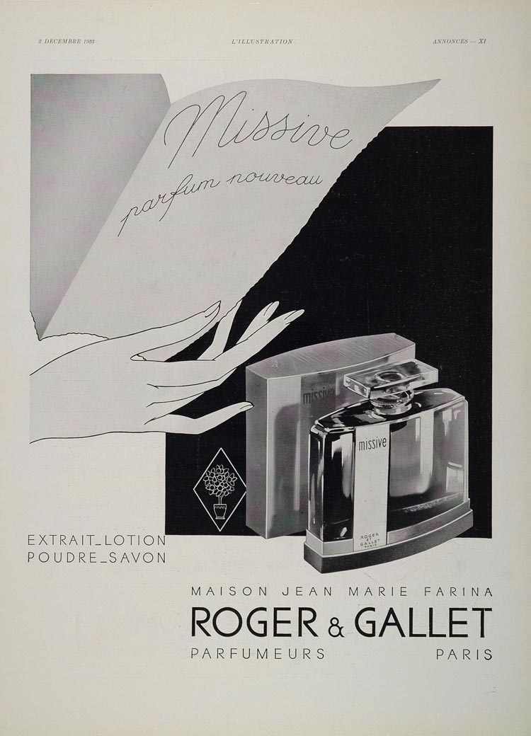 This is an original 1933 black and white French ad for Missive perfume from Roger & Gallet.