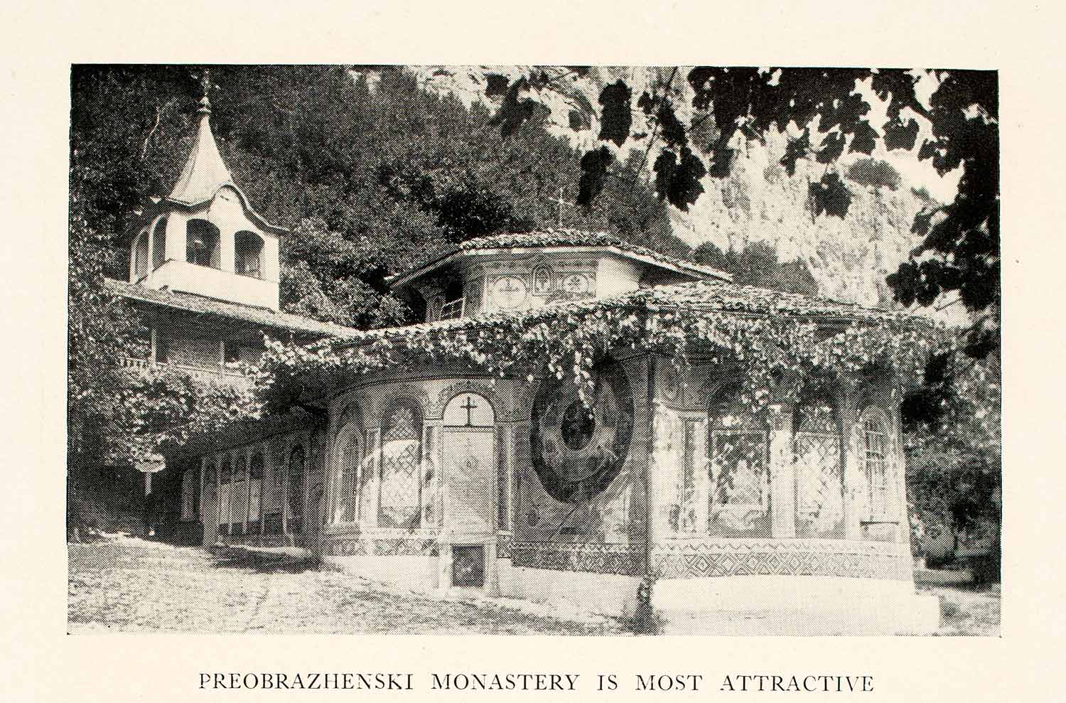 This is an original 1933 black and white halftone print of the Preobrazhensky Monastery in Bulgaria.