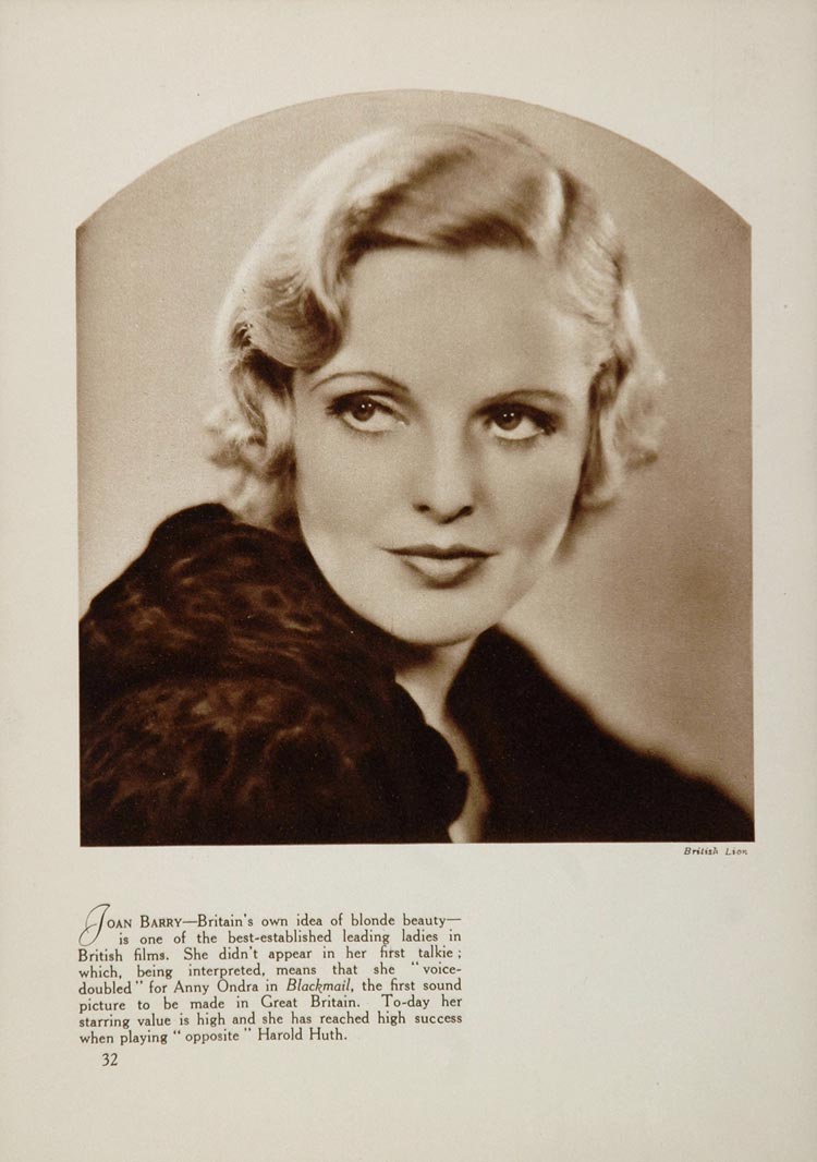 Joan Berry (1903-1989) Born in London, she is perhaps best-known for being the "voice-double" for Anny Ondra in Blackmail (1929) directed by Alfred Hitchcock, the first sound picture to be made in Great Britain. Some of her other films include: A Man of Mayfair (1931), Rich and Strange (1931), and Sally Bishop (1932).