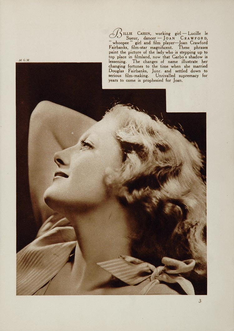 Joan Crawford ( 1904-1977) Born Lucille Fay LeSueur in San Antonio, Texas, her stage name of Joan Crawford was chosen for her by the public. She was a dancer first and then made her name in film playing socialite or rags-to-riches shop girl roles. Some of her many films include: Pretty Ladies (1925), Sally, Irene and Mary (1925), The Boob (1926), Paris (1926), Our Dancing Daughters (1928), The Duke Steps Out (1929), Our Modern Maidens (1929), Grand Hotel (1932), Mildred Pierce (1945) for which she won an Oscar, and What Ever Happened to Baby Jane? (1962).