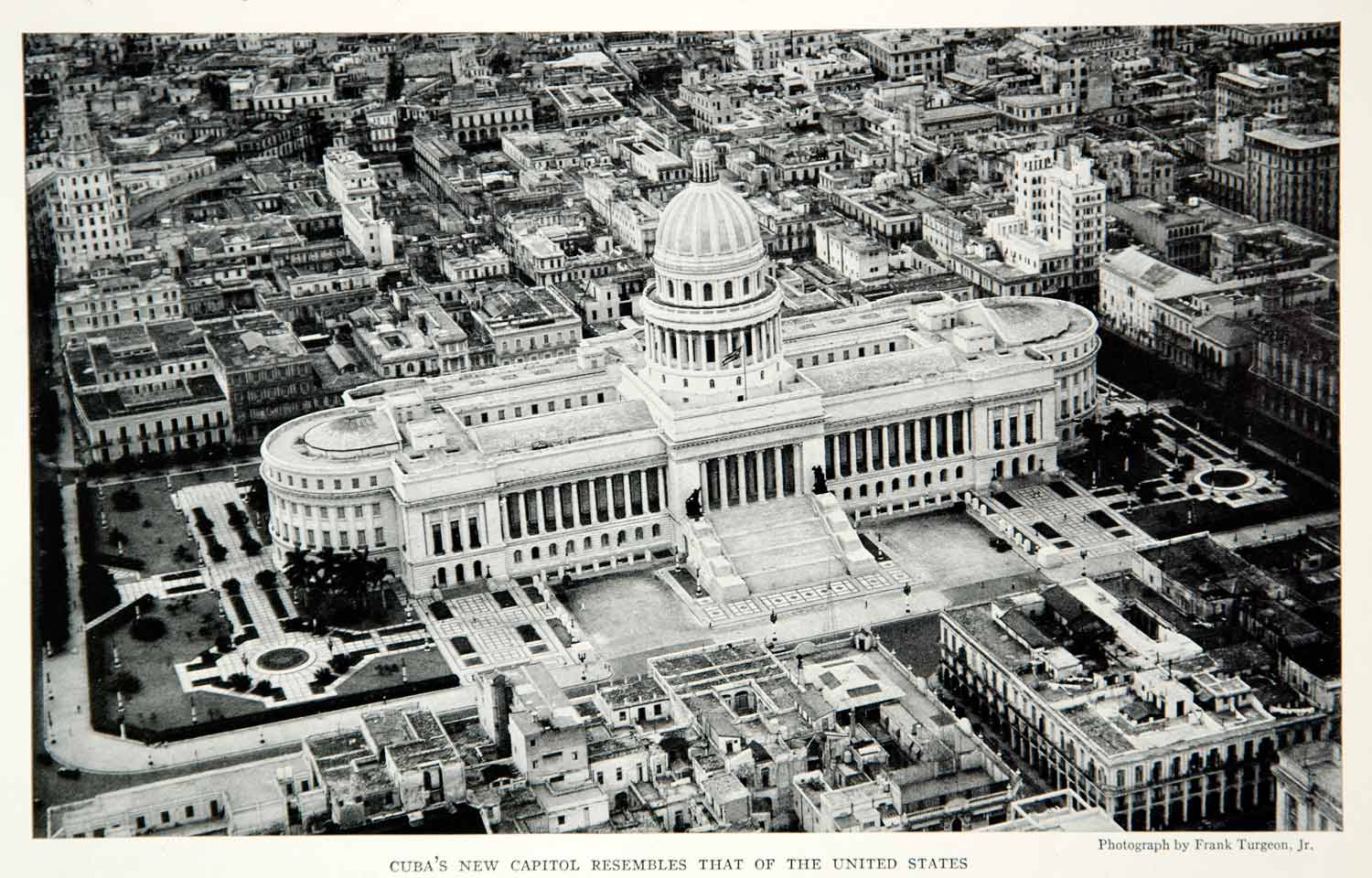 This is an original 1933 black and white halftone print of an aerial view of the Capitol Building of Cuba, in Havana