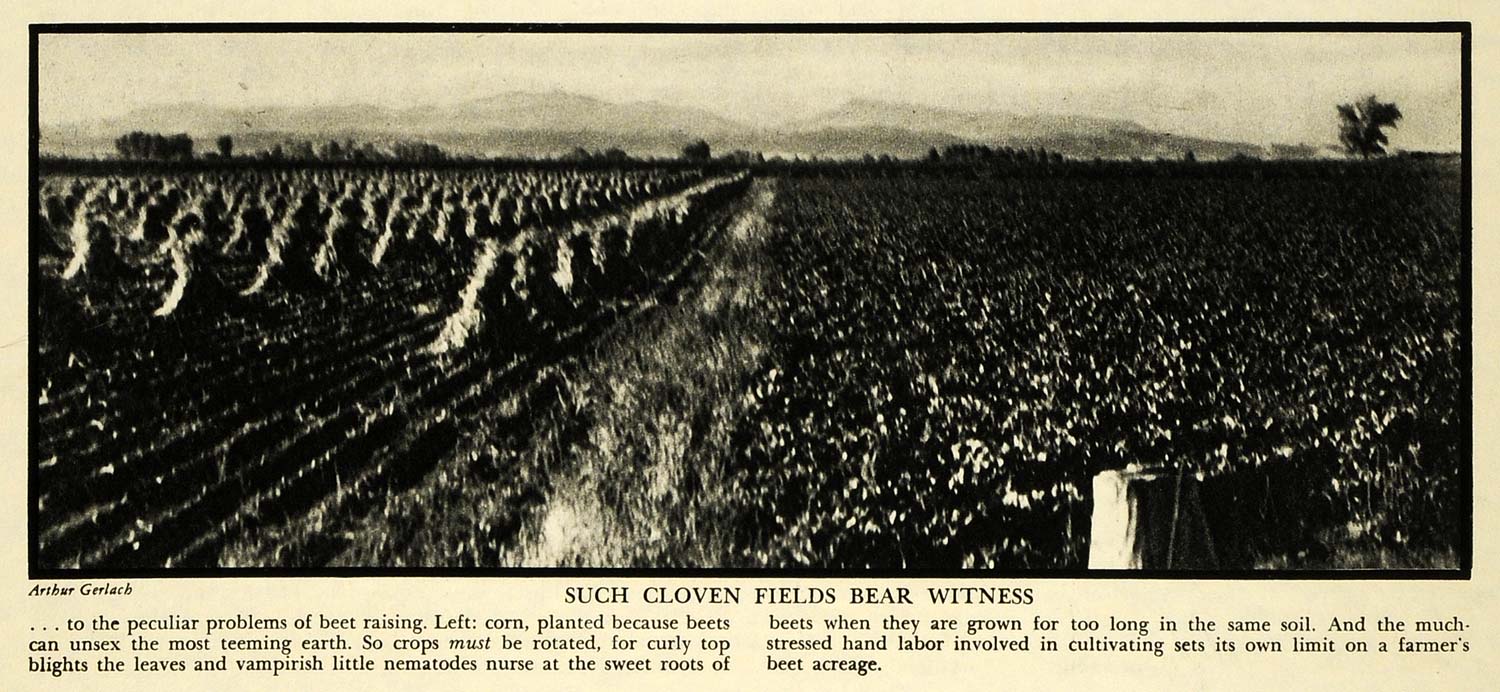 This is an original 1933 halftone print of a farmer's field. The caption writes, "Such cloven fields bear witness to the peculiar problems of beet raising. Left: corn, planted because beets can unsex the most teeming earth. So crops must be rotated for curly top blights the leaves and vampirish little nematodes nurse at the sweet roots of beets when they are grown for too long in the same soil..."