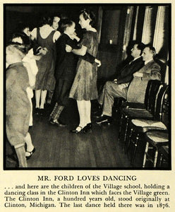 This is an original 1933 halftone print of children dancing. The caption writes, "Mr. Ford loves dancing and here are the children of the Village school, holding a dancing class in the Clinton Inn which faces the Village green. The Clinton Inn, a hundred years old, stood originally at Clinton, Michigan. The last dance held there was in 1876." Photography by Aikins.