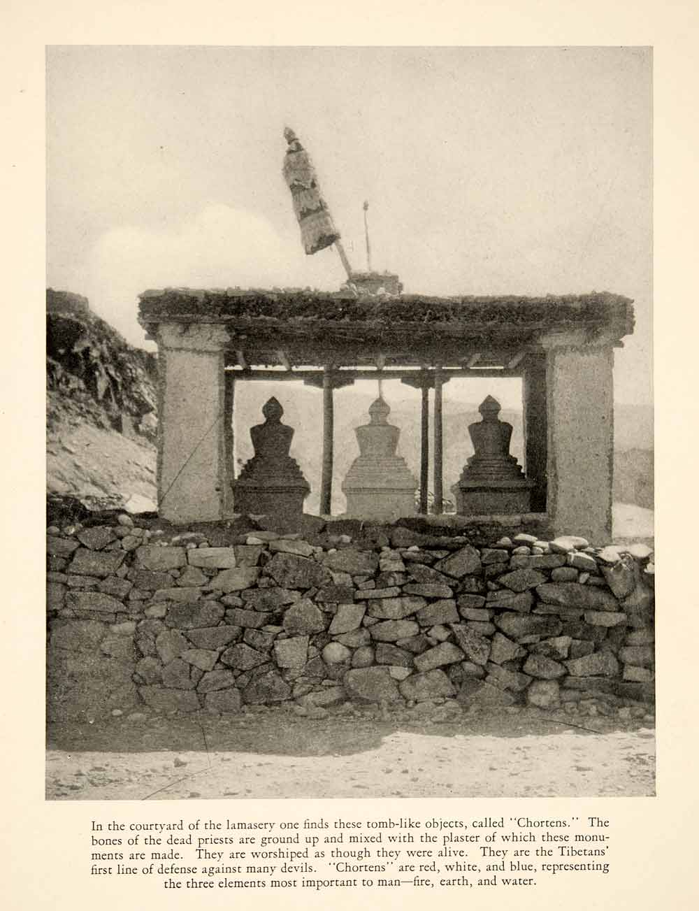 This is an original 1933 black and white halftone print of "A Courtyard of a Lamasery where the tomb-like 'Chortens' are made of the ground-up bones on dead priests and mixed with the plaster that makes these monuments.