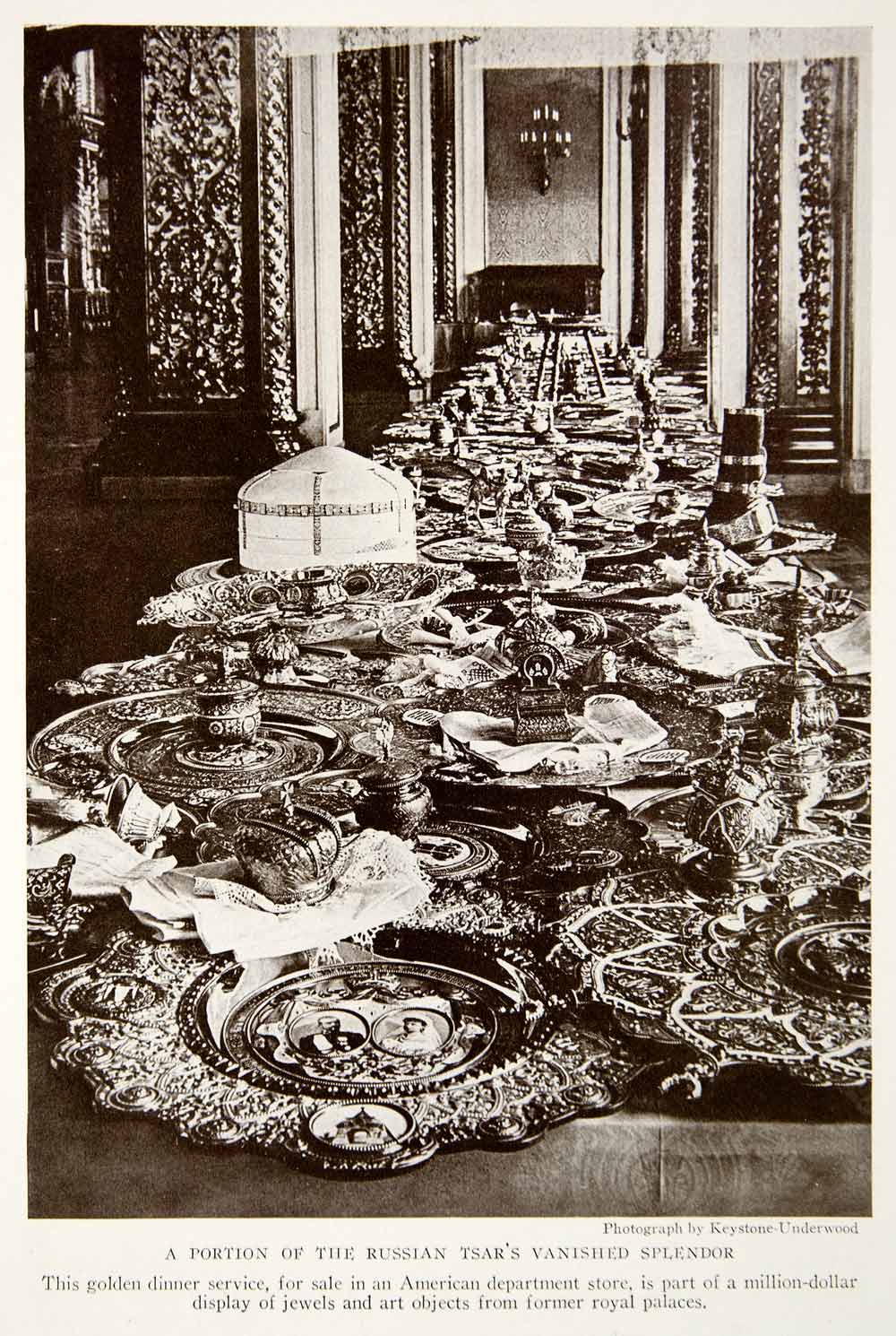 This is an original 1933 sepia halftone print of a small portion of the Russian Tzar's dinner service, which is for sale in an American department store.