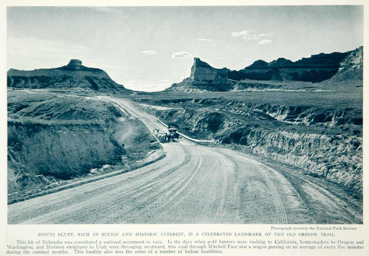 This is an original 1933 black and white halftone print of the landscape around Scotts Bluff, a landmark of the Oregon Trail.