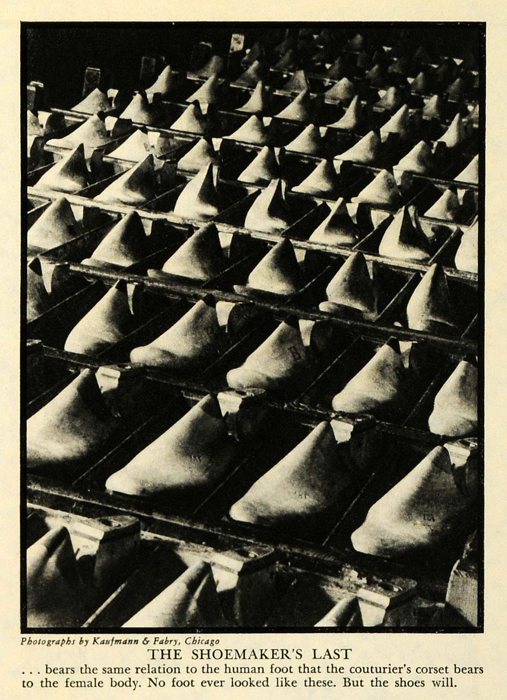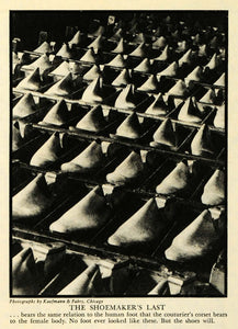 This is an original 1933 halftone print of shoes at the International Shoe company of Holly Springs, Mississippi. The caption writes, "The shoemaker's last bears the same relation to the human foot that the couturier's corset bears to the female body. No foot ever looked like these. But the shoe will."