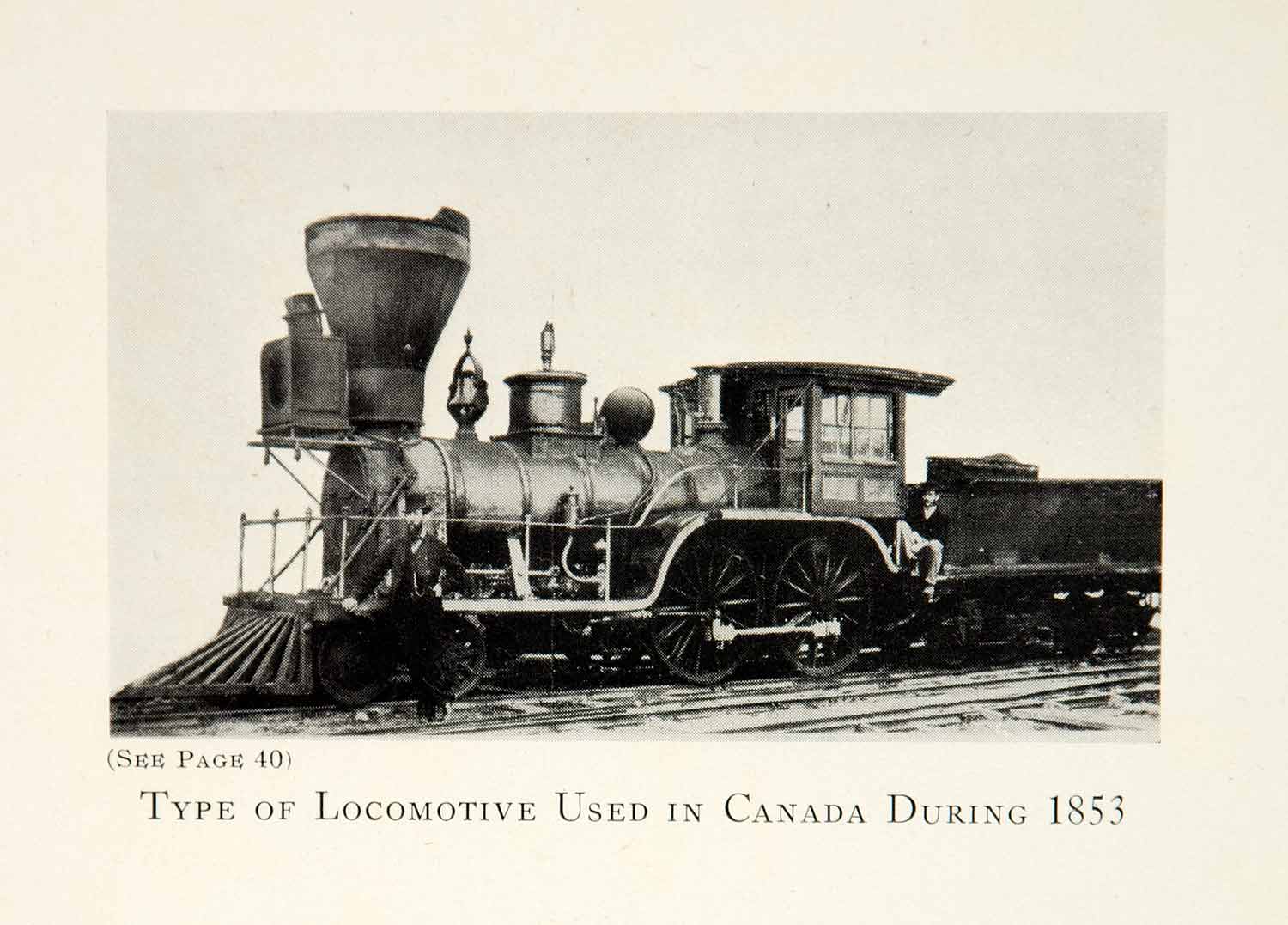 This is an original 1933 black and white halftone print of a photograph an example of the typical steam engine locomotives that were operated by Canadian railways in 1853.