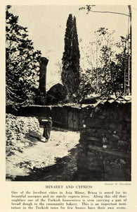 This is an original 1933 halftone print of a rural scene of the city of Bursa in Turkey, a Eurasian country located between Asia and Europe. Brusa is the historical name of the city Bursa. This city is one of the loveliest cities in Asia Minor, "is noted for its beautiful mosques and its stately cypress trees". This halftone print features a Turkish housewife carrying a pan of bread.
