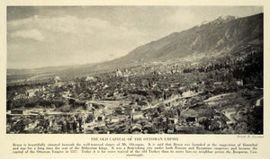 This is an excellent original 1933 halftone print featuring an aerial view of the city of Bursa, the old capital of the Ottoman Empire (a Turkish empire that lasted from 1299 to 1923) in Turkey, a Eurasian country located between Asia and Europe. Brusa is the historical name of the city Bursa. This city is "beautifully situated beneath the well-watered slopes of Mount Olympus", a mountain in Bursa Province, Turkey. Bursa is one of the loveliest cities in Asia Minor, is noted for its beautiful mosques and its stately cypress trees. The city cypresses are even more numerous for it has been the custom of the people to plant a cypress tree for each new burial in the cemetery.