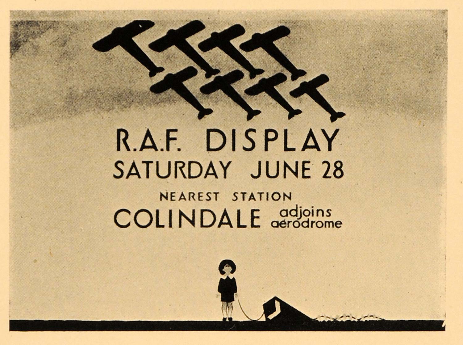 This is an original 1933 halftone print of a London Underground Railway poster for the R.A.F. display at the aerodrome near the Colindale Tube Station in London. (Please note that, typical of halftone prints, there is printing on the reverse.)