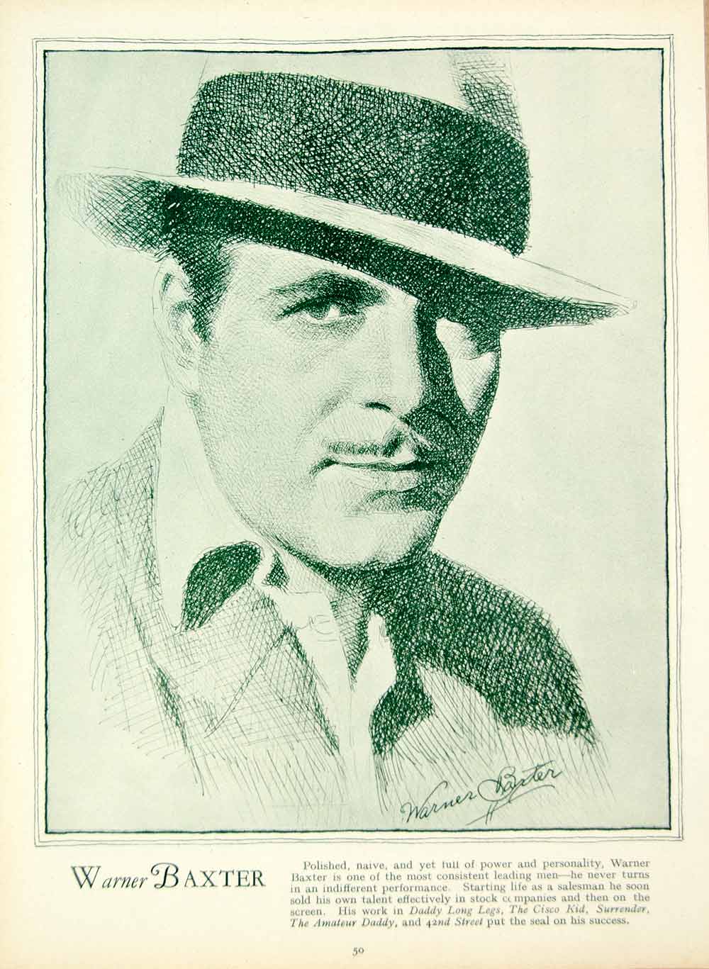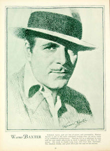 This is an original 1933 duotone rotogravure of a sketch of the movie actor, Warner Baxter (1889-1951). He was known for his role as The Cisco Kid in "In Old Arizona" (1929).