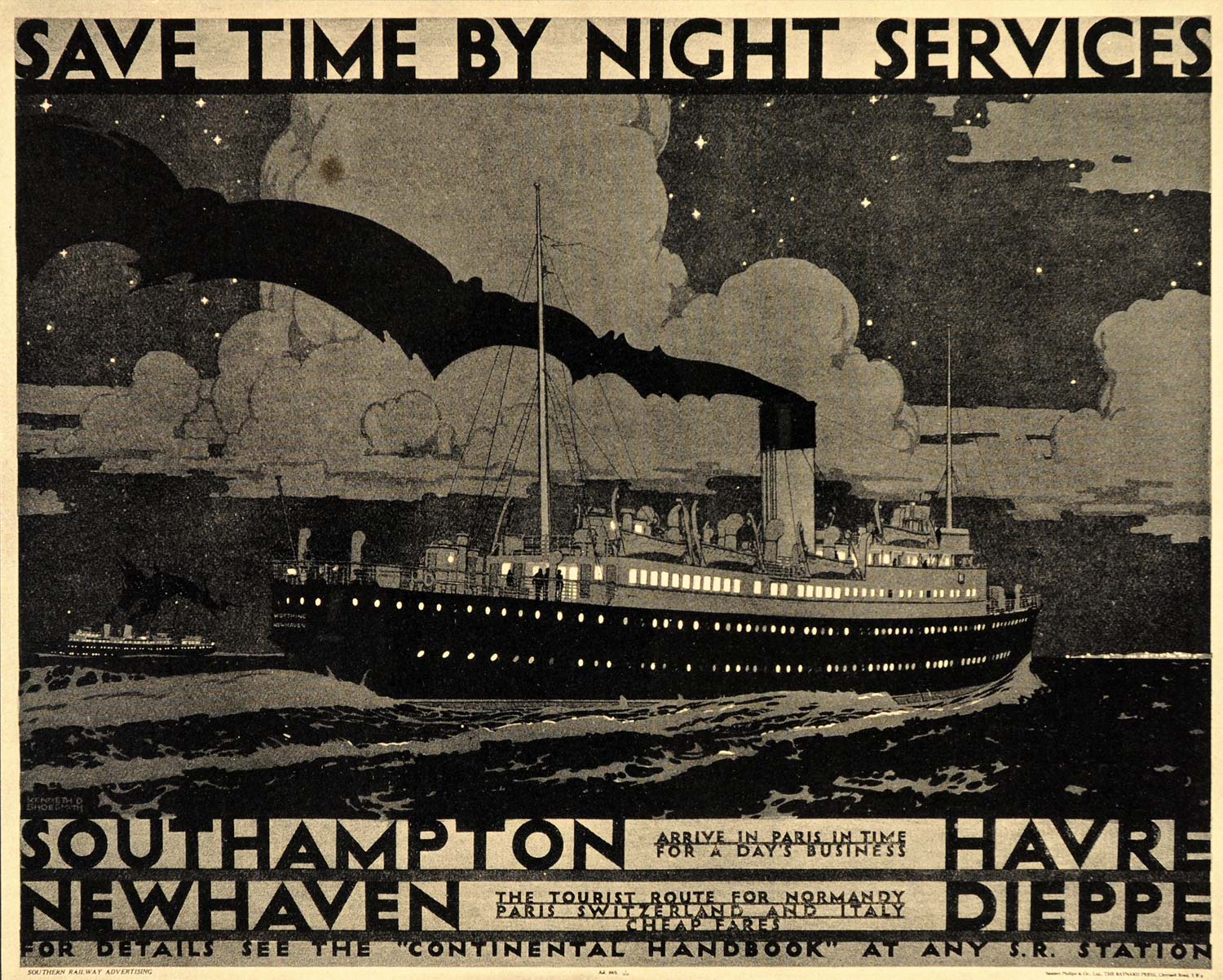 This is an original 1933 halftone print of a poster for the Southern Railway advertising their night service from Southampton to Havre and Newhaven to Dieppe.