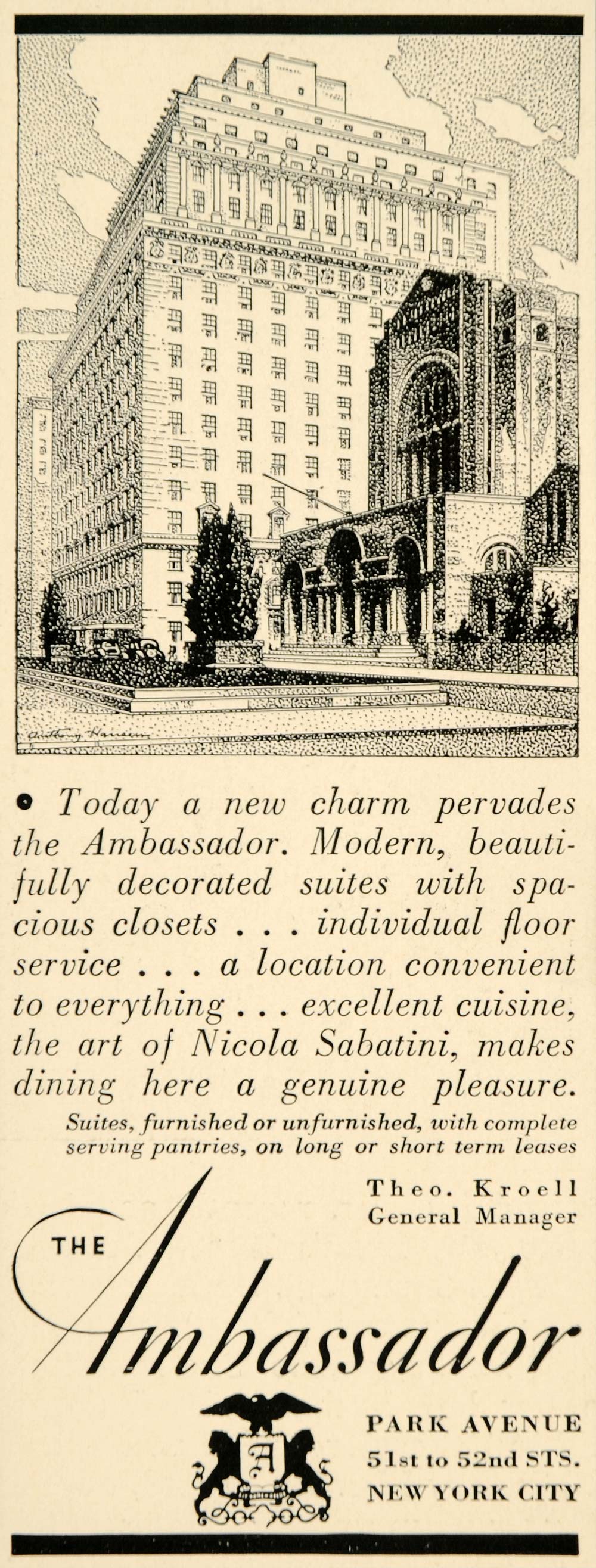This is an original 1934 black and white print ad for The Ambassador Hotel located on Park Avenue at 51st to 52nd Streets in New York City. Theo. Kroell was General Manager.