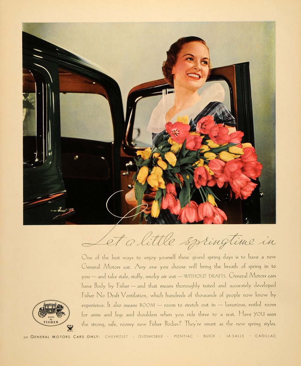 Keywords specific to this image: Vintage Automobiles, Antique Automobiles, Car Enthusiasts, Chevrolet, Oldsmobile, Pontiac, Buick, La Salle, Cadillac, No Draft Ventilation, Spring Flower Bouquet Vintage Advertising